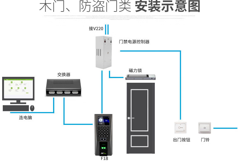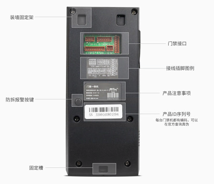• 继电器控制输出:支持 NC/COM/NO 接法,适配电磁锁(断电开锁)或电插锁(通电开锁)