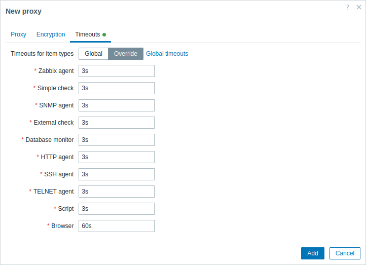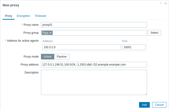 | Proxy name | 输入proxy名称。它必须与proxy配置文件中的Hostname参数中的名称相同。 | |