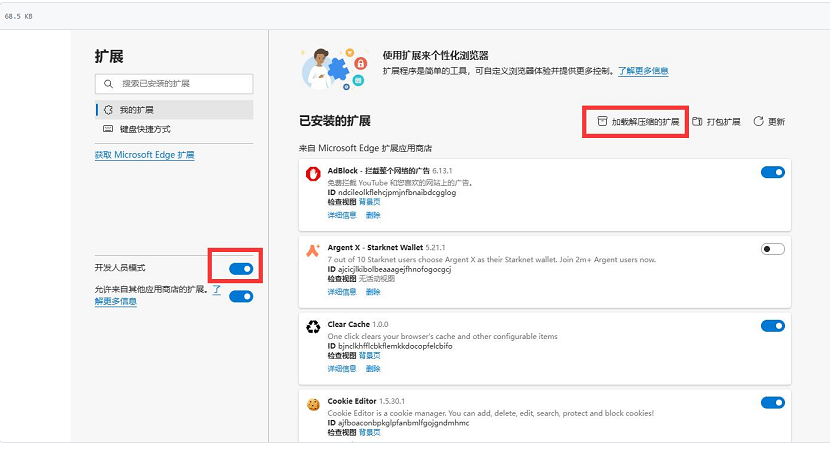 • Edge: 访问 edge://extensions/