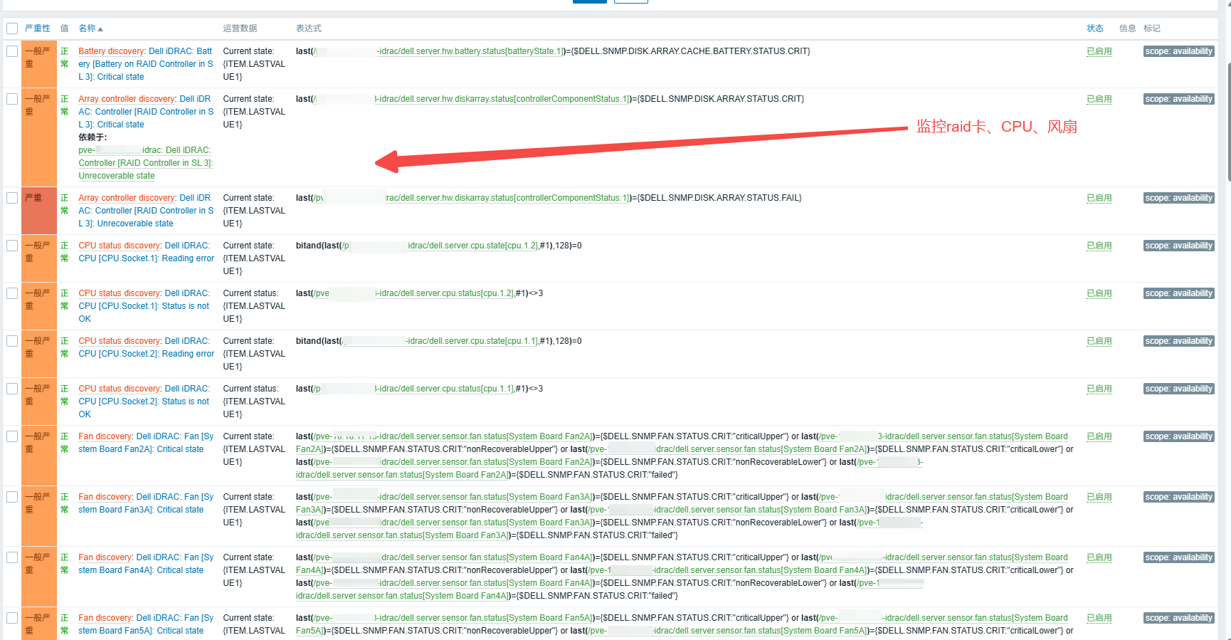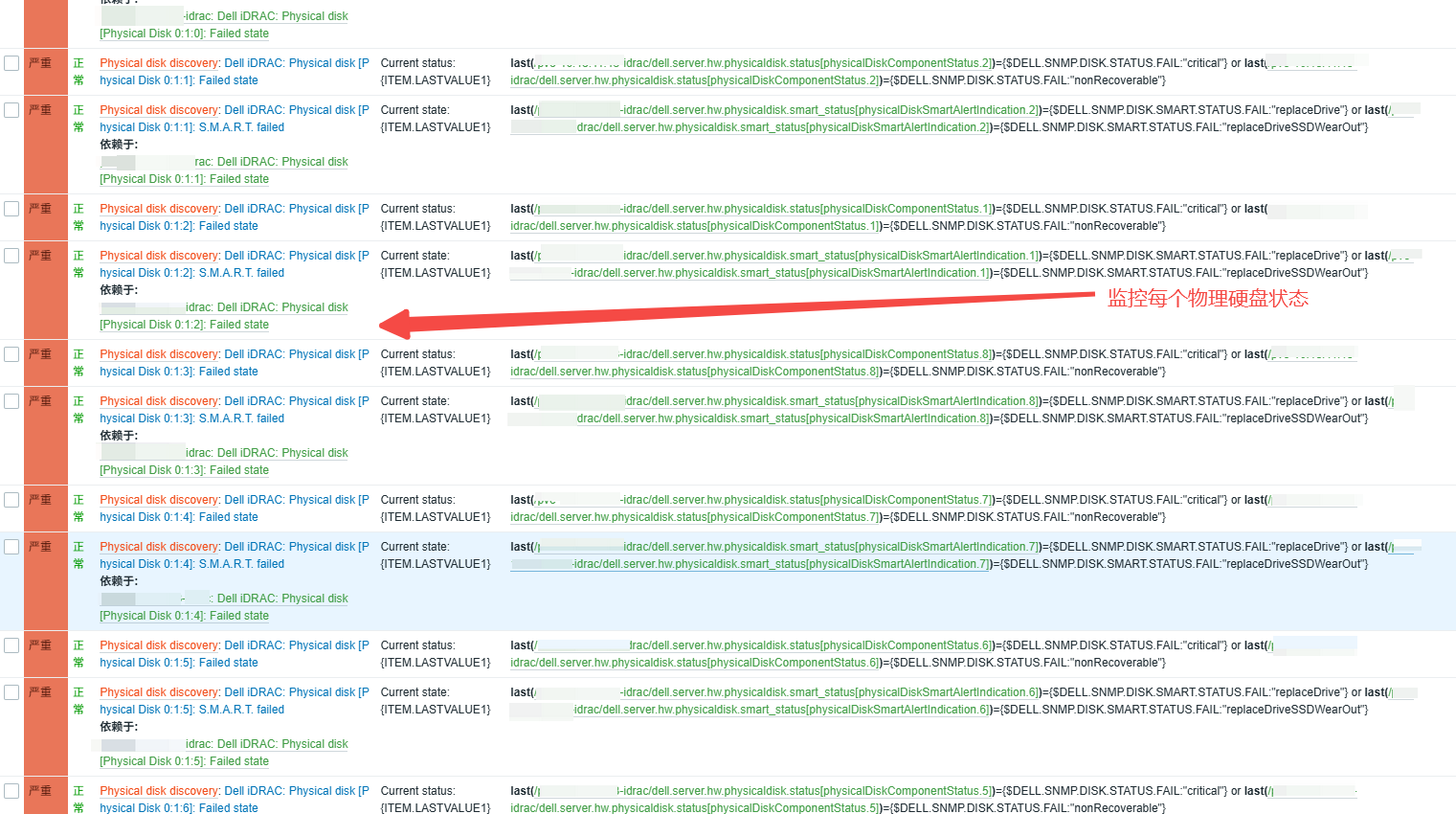 适用于通过 SNMPv2c 协议在 Zabbix 中监控 Dell iDRAC 的硬件健康状态,包括温度、风扇、电源、硬盘、CPU、RAID卡、内存错误等。
