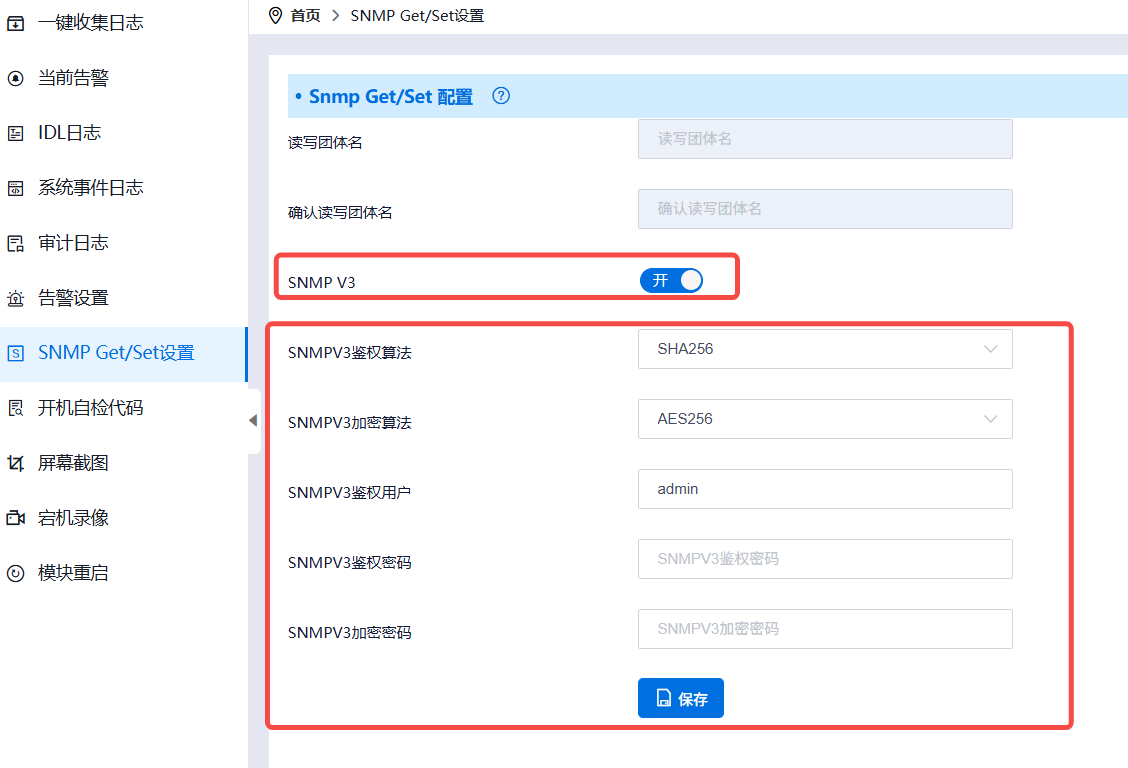 - 进入菜单:日志和告警 → SNMP SET/GET 设置