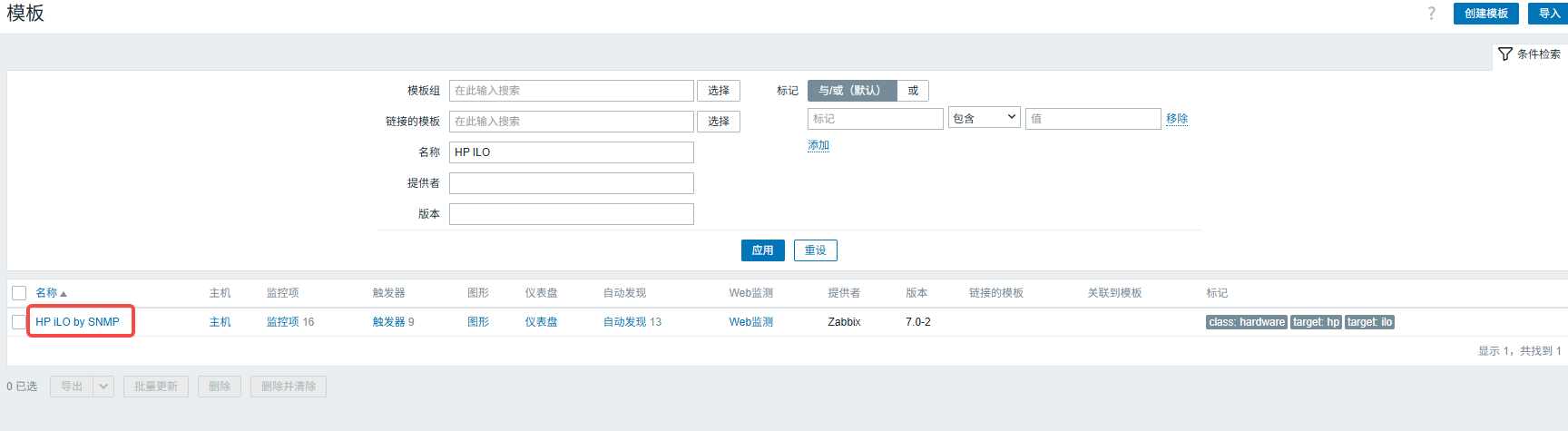 因为我这边HP服务器比较旧,没有合适的ILO口去配置测试,所以配置文档请参照DELL服务器配置流程,大差不差,且zabbix模板中已经自带了HP ILO by SNMP